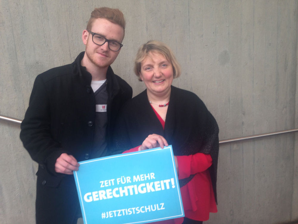 Nach einer Begrüßungsrede des stellvertretenden Landesvorsitzenden Frederick Brütting wurde der Leitantrag des Landesvorstandes von unserer Landesvorsitzenden Leni Breymaier eingebracht. In diesem geht es um wichtige Themen: Gerechte Arbeit, bezahlbarer Wohnraum, gute Rente, Bürgerversicherung und Steuergerechtigkeit. Direkt nach den Wortbeiträgen zum Leitantrag war unser Kanzlerkandidat und designierter Bundesparteivorsitzender Martin Schulz zu Gast. Die Stimmung der Genossinnen und Genossen während der Rede von Schulz war unbeschreiblich: Immer wieder gab es nicht endende Standing Ovations. Martin Schulz sprach in seiner Rede über die Kernthemen der SPD: Freiheit, Gerechtigkeit und Solidarität. Er bemängelte, dass viele Menschen nicht in gerechtem Maße an Deutschlands Reichtum teilhaben können, weil es viele Ungerechtigkeiten gibt. So gibt es zum Beispiel Konzernchefs, die ihre Firmen beinahe in den Bankrott geführt haben und trotzdem einen unverschämt hohen Bonus bekommen. Andererseits gibt es Arbeitnehmer und Arbeitnehmerinnen, die Vollzeit arbeiten und trotzdem noch einen zweiten Job ausüben müssen, um für ihre Familien sorgen zu können. Außerdem versprach Schulz, dass es einen fairen Wahlkampf ohne Hass geben wird. Martin Schulz erntete für seine Rede unbändigen Applaus und auch Adrian Pelz ist begeistert: „Martin Schulz ist eine ernsthafte Alternative zur Kanzlerin – Er versteht es, Klartext zu reden und hat konkrete Vorschläge wie man Deutschland besser gestalten kann. Ich denke, die Leute haben genug von Merkels Mutlosigkeit und dem „immer weiter so“; sie wollen einen Kandidaten, der etwas bewegt, klare Ziele hat und für die Menschen da ist. All das bieten Martin Schulz und die SPD.“