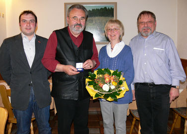 Jubilar Gerhard Schollenberger mit Ehefrau Ann-Christin sowie Kreisvorsitzender Timo Steinhilper (li) und OV-Stellvertreter Kurt Bickel - Foto: A. Garhöfer Gerhard Schollenberger für 40 Jahre Mitgliedschaft geehrt – Willy-Brandt-Medaille überreicht